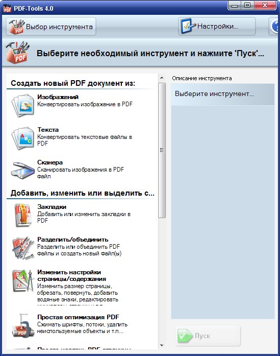 В комплекте с профессиональной версией PDF-XChange поставляется также PDF-Tools - инструмент для создания новых PDF-файлов из изображений и манипулирования имеющимися файлами. С помощью этого инструмента можно с легкостью объединять PDF-файлы, удалять из них страницы, извлекать отдельные фрагменты, изображения и текст, создавать и редактировать закладки, а также отправлять файлы по электронной почте и размещать их на серверах по протоколам HTTP и FTP.