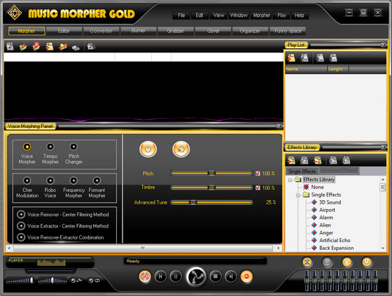Кроме того, AV Music Morpher Gold включает программу записи MP3 и устройство автоматической смены дисков. В отличие от других MP3 проигрывателей, таких как Winamp, MusicMatch, RealPlayer или Windows Media Player, Music Morpher Gold может проигрывать и изменять музыку в режиме реального времени. Смеситель эффектов и библиотека эффектов разработаны для ваших разнообразных вкусов. Этот комплект инструментов также работает как MP3 конвертер, очень полезный в преобразовании MP3 в WAV, WMA или в любой из 10 поддерживаемых форматов музыки. Music Morpher Gold an easy CD creator поставляется с: CD ripper для записи звуковых дорожек на жесткий диск, устройством записи для записи аудио компакт-диска, компакт-диск с данными и DVD данными, дизайнером обложек для проектирования обложек для компакт-дисков и DVD. Мультиформатный аудиопроигрыватель поддерживает форматы MP3, MP2, WMA, WAV, APE, OGG, AU, IRC. AV Music Morpher Gold - лучший выбор для запуска дорожек в различных форматах, особенно музыки, загруженной из различных file sharing систем, таких как Kazaa, iMesh, eMusic, Napster, and Music Net. Music Morpher Gold совместим с караоке. Music Morpher Gold идеально подходит для оперативной трансформации музыки, смешивания музыки, создания заказного CD, караоке CD, звуковой дорожки и аудио клипов.