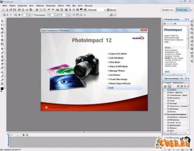 Небольшой размер, приятный внешний вид, интуитивно понятный интерфейс, высокая скорость работы, огромный набор текстур, шаблонов и эффектов, полностью охватывающий все возможные задачи по созданию и редактированию графики - все это Ulead PhotoImpact.