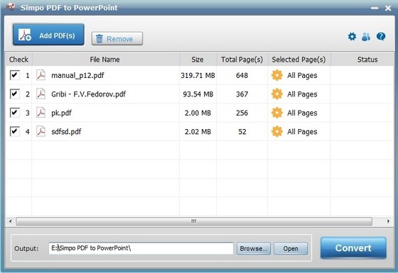 The interface of Simpo PDF to PowerPoint Converter is simple and friendly. Even if a computer beginner can convert PDF to PowerPoint effortlessly with it, just add PDF files, click "Convert" button, done!