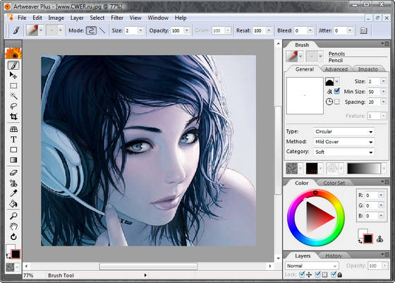 Artweaver по внешнему виду напоминает Photoshop - те же панели истории и слоев, палитра инструментов, область предварительного просмотра. Однако, в отличие от графического редактора от Adobe, эта программа содержит только инструменты для рисования. Используя их, можно раскрашивать изображения кистями, добавлять текст, заливку и градиент, рисовать линии, производить обрезку и т.д. Есть даже инструменты "штамп" и "волшебная палочка". Artweaver содержит очень удобные средства для выбора цвета: его можно выбирать как на цветовом круге, так и из набора наиболее часто используемых цветов. Одним словом, это отличная программа для детей и начинающих художников.