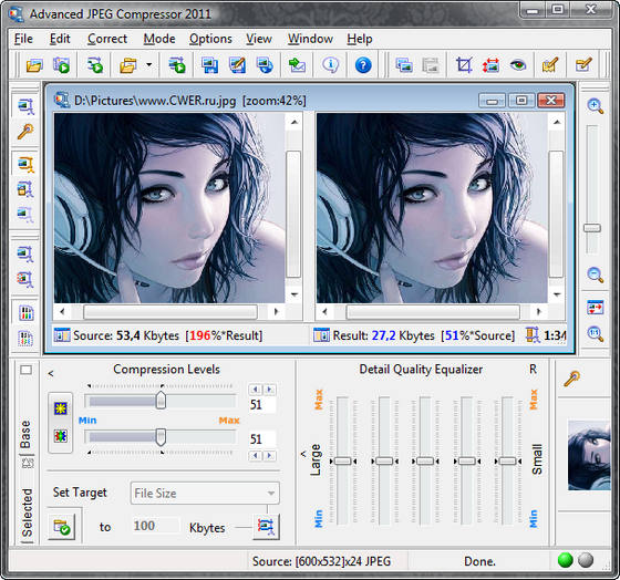 Advanced JPEG Compressor - одна из самых функциональных программ для сжатия изображений в формате JPEG. Возможно сжатие до 50% без потери качества. Программа обладает практически всем, что может только пожелать пользователь от программы для сжатия изображений. Главной особенностью программы является возможность просмотра сжатого изображения в режиме реального времени, т.е. вы увеличиваете или уменьшаете уровень компрессии, и картинка тут же изменяется. Таким образом, вы можете сразу увидеть результат...