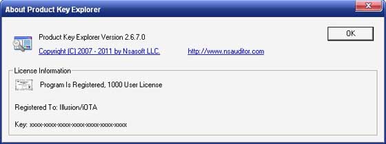 Product Key Explorer - позволяет расшифровать и увидеть, а также сохранить серийные номера (Product ID, Product Key, License Info, User Name, Company) продуктов Microsoft, CD-key установленных на компьютере программ, и не только их. Неполный список ПО, регистрационные данные которых можно увидеть и сохранить: Micrsoft Windows (2000, XP, 2003, Vista), Microsoft Office 2003, Microsoft Office 2007, Microsoft Office XP, Micrsoft Visual Studio 2005, Macromedia, Ahead Nero, Adobe Photoshop, CyberLink PowerDVD, Borland Delphi и т.д.