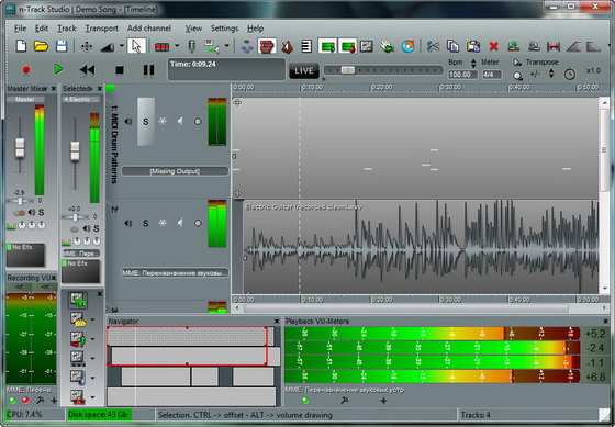 n-Track Studio - полнофункциональная многотрековая аудиостудия, позволяющая создавать свои собственные музыкальные композиции профессионального качества. Программа работает с большинством аудиоформатов, позволяет накладывать всевозможные эффекты на каждый трек с прослушиванием в реальном режиме времени, работать с каналами, исправлять синхронизацию и т.п. Кроме таких стандартных эффектов, как Reverb, Compression, EQ, Echo, Auto volume, Pitch Shift и Chorus, программа позволяет использовать DirectX и VST 2.0 плагины от сторонних разработчиков.