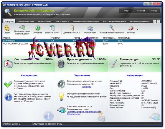 Ashampoo HDD Control - программное обеспечение для контроля за состоянием жестких дисков. Выполняет обслуживание жесткого диска для Вас. Позволяет предотвратить потенциальные отказы и аварии прежде, чем они произойдут. Программное обеспечение поддерживает жёсткие диски типа IDE и последовательные ATA. Ashampoo HDD Control предоставляет пользователю все важные факты и информацию о дисководе, включая регистрационный номер, версию БИОСА (прошивки), размер кэша, количество разделов, на которые разбит хард, свободном месте на диске и текущей температуре.