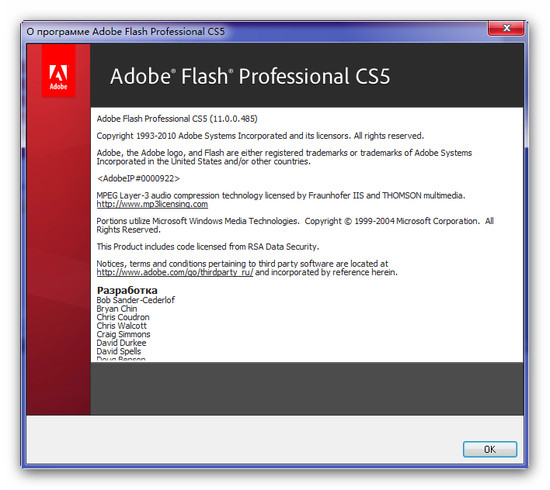 - В комплекте отсутствуют Bridge, ExtendScript Toolkit и Pixel Bender Toolkit, присутствуют Adobe Flash CS5 Professional, Adobe Extension Manager CS5, FlashPlayer