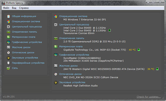 Speccy - это небольшая утилита от разработчиков популярнейшего приложения для очистки компьютера от системного мусора CCleaner. При запуске Speccy мониторит аппаратную часть компьютера, и отображает информацию об операционной системе и характеристики установленного железа. С помощью программы пользователь сможет узнать версию операционной системы, подробную информацию о процессоре, операционной памяти, винчестере, материнской плате, видео карте и др. Кроме того, отображаются температурные показатели процессора и видеокарты, а также рабочая частота RAM и скорость шины процессора.
