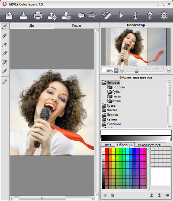 В программу включена богатая Библиотека цветов для выбора тончайших оттенков кожи, волос, листвы, неба и других естественных тонов. Есть возможность сохранять и загружать "штрихи", одним щелчком мыши изменять выбранный цвет. Дополнительный инструмент - Перекрашивающая кисть - позволяет откорректировать полученный результат автоматического раскрашивания. Также кисть может быть использована и как самостоятельный инструмент для раскрашивания вручную.