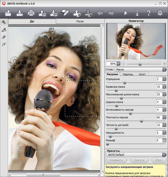 В отличие от других компьютерных программ, претендующих на звание цифрового художника, ArtWork позволяет создать именно картину, произведение искусства, а не искаженную геометрическими линиями фотографию. Автоматическая обработка дает качественный результат, а для максимального приближения к идеалу можно воспользоваться инструментом Направление мазков, который является настоящей находкой разработчиков и украшением программы. Этот уникальный инструмент предоставляет вам полный контроль над наложением мазков. В тех областях, где это необходимо, достаточно провести указательные штрихи. Программа пересчитает изображение с учетом ваших пожеланий, мазки будут переориентированы вдоль направляющих линий.
