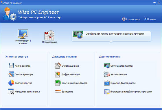 Wise PC Engineer - один из лучших наборов утилит для оптимизации и настройки Windows, очистки системы от мусора, дефрагментации жесткого диска и реестра, восстановления удаленных файлов. Также есть встроенный оптимизатор оперативной памяти, возможность отключения питания ПК по-расписанию, функция 1-Click Tune-up для ускорения работы системы за один щелчок!