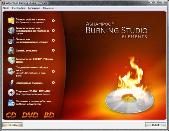 Ashampoo Burning Studio Elements - программа, с помощью которой Вы можете записать фильмы, музыку и данные - быстро и эффективно. Программное обеспечение с интуитивно понятным пользовательским интерфейсом предлагает Вам компактные функции для того, чтобы выполнять все задачи, касающиеся Ваших проектов записи – легко, создаёт диски данных, записывает резервные копии, музыкальные рипы, создаёт аудиокомпакт-диски или записывает уже существующие пленочные файлы на диски Blu-ray. С Ashampoo Burning Studio Elements Вы можете также записать HD - и full HD диски (720p and 1080p), если уже существующие файлы были сохранены в готовых папках. Аудиокомпакт-диски могут быть также эффективно и удобно рипованы с этим программным обеспечением. Интегрированный аудиоплеер позволяет Вам проиграть аудиофайлы и CD непосредственно, таким образом, Вы можете не открывать другой аудиоплеер, чтобы прослушать музыкальные заголовки. Ashampoo Burning StudioElements в один миг поможет разработать и напечатать покрытия, метки и буклеты в различных форматах. Запишите CD, DVD и Диски Blu-ray быстро и удобно!