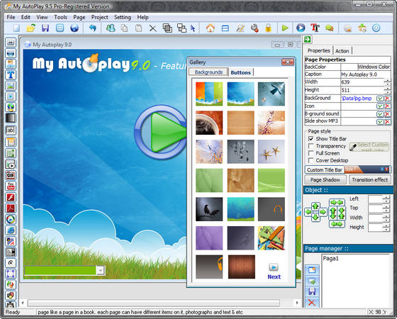 My Autoplay Professional - является одним из самых популярных и легких инструментов для создания профессиональных меню автозапуска, интерактивных презентаций, мультимедийных приложений и заказного программного обеспечения в считанные минуты без опыта программирования. Используйте ваш любимый контент, такой, как изображения, видео, музыка, Flash, текст, кнопки, гиперссылки и многое другое! Меню, которое появится когда вы вставите ваш CD / DVD диск в дисковод, позволит вам запускать приложения, открывать документы, проигрывать фильмы, открывать веб-сайты, отправлять электронную почту, работать со звуковыми файлами, а также делать многое другое.