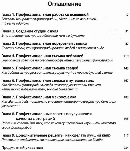 Это книга о том, какую кнопку нажать, когда и какую настройку выбрать. На каждой странице книги описывается отдельная комбинация действий, настроек, инструментов или профессиональных приемов, которые помогут превратить фотографию из обычного снимка в художественное произведение. Если вам надоело делать "нормальные" фотографии и вы разглядываете иллюстрации в глянцевых журналах, спрашивая себя: "Почему мои снимки выглядят по-другому?" — вы нашли нужную книгу.