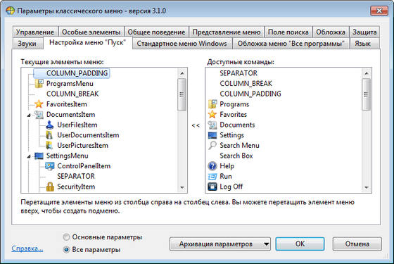 - Параметры, Избранное, расширение панели управления, и т.д.