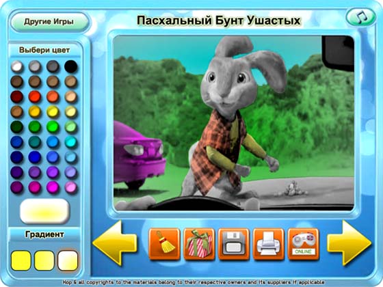 Вы уже наверняка слышали о предстоящей премьере нового фильма «Бунт Ушастых», посвященного религиозному празднику Пасхи. Сегодня у вас есть уникальная возможность познакомиться поближе с главным героем этого анимированного фильма, пасхальным зайцем Хопом. В новой игре-раскраске вы сможете не только посмотреть сцены из фильма, но и раскрасить их по вашему вкусу! Проявите ваши художественные способности и сделайте черно-белый мир Хопа цветным и прекрасным!