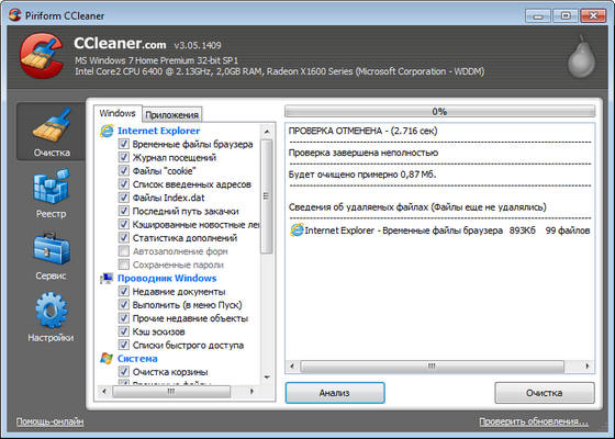 CCleaner также очищает временные файлы и списки недавно открытых файлов других программ, например: Media Player, Safari, eMule, Kazaa, Google Toolbar, Netscape, MS Office, Nero, Adobe Acrobat, WinRAR, WinAce, WinZip и другие...