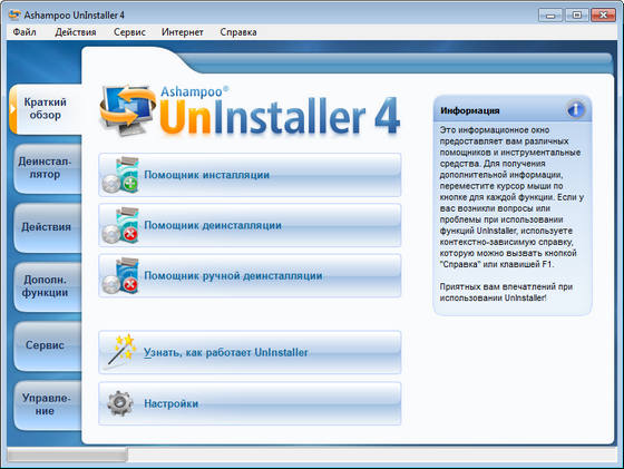 Ashampoo UnInstaller - деинсталлятор программ с прекрасно организованным интерфейсом и алгоритмом работы. Эта утилита отслеживает и регистрирует изменения, которые вносят инсталляционные программы, что позволяет при необходимости корректно удалить ненужную программу. Положительным качеством является то, что данная программа удаляет не только те приложения, что были отслежены ей, но и путем анализа деинсталлирует программы, мониторинг которых не производился. Кроме своей основной функции, программа способна удалять дубликаты и временные файлы, управлять установленными в систему шрифтами. Имеет стильный пользовательский интерфейс с мультиязычной поддержкой, включая русский язык.