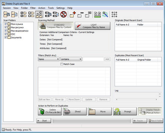 Delete Duplicate Files - мощный высокоскоростной инструмент для удаления одинаковых файлов с компьютера. Имеет разнообразие дополнительных критериев сравнения и фильтров, включая правило определения самого оригинального файла.Предлагает три варианта действий по выявленным дубликатам: удаление, полное удаление и перемещение. Интуитивно понятный интерфейс и возможность вывода для просмотра статистики и ведение логов работы.