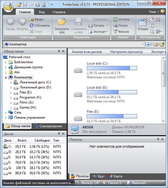 - Просмотр общего и свободного пространства для стационарных, съемных и сетевых дисков
