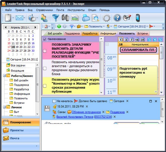 - Планирование на предприятии - планировщик LeaderTask может быть использован для управления бизнесом - организации деловых встреч, хранение бизнес контактов, составление планов реализации проектов, для планирования деятельности.