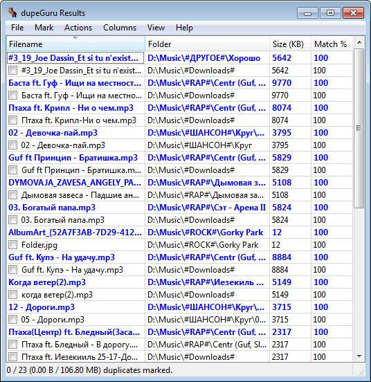 dupeGuru – сервисная программа для обнаружения дублированных файлов на вашем компьютере. Данная программа может сканировать по именам файла и по содержимому. Сканирование по имени файла представлено умным алгоритмом отмечания, который позволяет найти дублированные имена файлов даже когда они не совсем одинаковые. Вы сможете найти все дубликаты за несколько минут, благодаря встроенному алгоритму пометок.