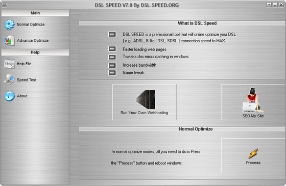 Программа DSL Speed на профессиональном уровне, увеличивает скорость DSL (ADSL, G.Lite, IDSL, SDSL) линий, за счёт внутренних настроек и оптимизации вашего компьютера к сети. Благодаря чему, во много раз увеличивает скорость передачи данных.