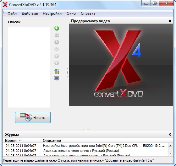VSO ConvertXtoDVD - программа предназначена для преобразования видео в формат, совместимый с DVD Video, и последующей записи содержимого на DVD. Создавайте DVD из различных видео форматов, чтобы смотреть их по телевизору на любом DVD плеере. ConvertXtoDVD был разработан так чтобы Вы ни о чём не думали. Добавьте 1 или несколько видеофайлов, вставьте пустой DVD и Ваши видеофайлы будут автоматически конвертированы и записаны на DVD с главами и изящным меню DVD. Не нужно никаких внешних кодеков.