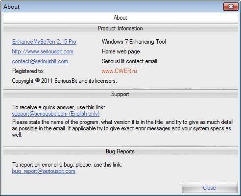 EnhanceMySe7en включает в себя менджер автозагрузки, менеджер процессов, модуль очистки жесткого диска, дефрагментатор жесткого диска, "чистильщик" системного реестра, монитор жесткого диска (температура, время работы, серийный номер и т.п.), модуль настройки интернет-соединения, а также средства для быстрого доступа к "тонким" настройкам операционной системы.