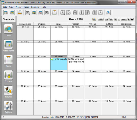 Кроме того, Active Desktop Calendar умеет «запоминать» и регулярно извещать пользователя о повторяемых событиях, автоматически вписывать в свою записную книгу продолжительные работы на пару дней/недель и т. д. – в общем, все, что требуется от нормального органайзера. Однако «изюминкой» программы по праву является система слоев, а фактически – отдельных записных книг, функционирующих одновременно (например, рабочая и персональная). В любой момент ненужный слой можно отключить, создать новый или поделиться его содержимым по локальной сети. Отличный выбор для домашнего пользователя!