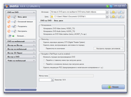 - 8 режимов копирования DVD на DVD:полный диск,основной фильм,разделение,переделывание,разделение по своему определению,клон,объединение и писать данные.
