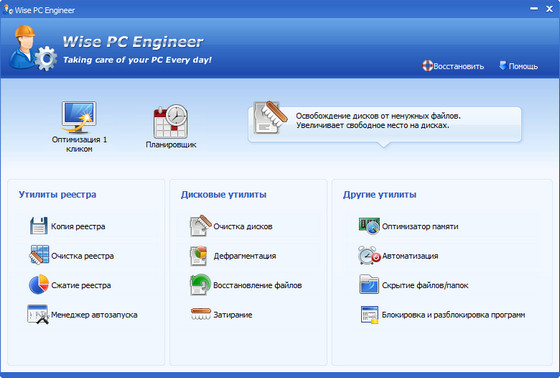 Wise PC Engineer - один из лучших наборов утилит для оптимизации и настройки Windows, очистки системы от мусора, дефрагментации жесткого диска и реестра, восстановления удаленных файлов. Также есть встроенный оптимизатор оперативной памяти, возможность отключения питания ПК по-расписанию, функция 1-Click Tune-up для ускорения работы системы за один щелчок!