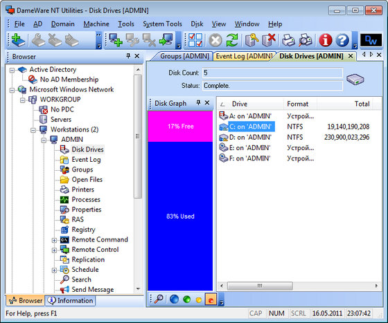 Интегрированные в DameWare NT Utilities (DNTU) средства администрирования Active Directory упрощают работу с каталогом и позволяют администраторам удаленно управлять одновременно несколькими сайтами AD непосредственно со своей рабочей станции. DNTU обеспечивает поддержку смешанного (Mixed) и "родного" (Native) режимов работы доменов AD, а также поддержку Exchange 2000. В отличие от конкурирующих продуктов удаленного управления мощные утилиты DNTU по работе с AD позволяют функционировать без ограничения, заключающегося в необходимости быть авторизованным в домене. Будучи подключенным к удаленной сети (VPN, например), администратор может одновременно подключиться к нескольким доменам Active Directory через интерфейс в привычном стиле Проводника.