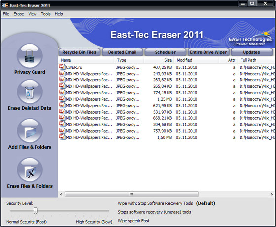 East-Tec Eraser - мощная программа для очистки Вашей системы от мусора и следов пребывания в интернете без возможности восстановления! Комплексное уничтожение таких данных как: история IE, история открываемых документов, cookies, переговоров в чатах, темп файлов IE и системы, свопа, кусков от Офиса, личные файлы, файлы по маске и т.д.