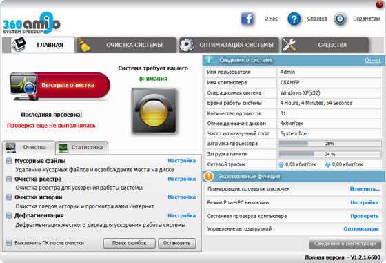 360Amigo System Speedup - это надёжный инструмент для оптимизации и очистки системы. Среди прочего, он удаляет неиспользуемые файлы из Вашей системы и очищает ошибки реестра, позволяя Вашему компьютеру работать быстрее и освобождая полезное место на Вашем жёстком диске. Он также очищает следы Вашей он-лайн активности в Интернет, например историю просмотра, cookie-файлы и неиспользуемые файлы. К тому же, он имеет утилиту для очистки реестра. Но самое главное в этой программе это то, что она мало весит, невероятно быстра и действенна (обычно её прогон занимает менее минуты). Как новички, так и опытные пользователи непременно оценят разнообразие функций, доступность отображения результатов и простой интерфейс программы. При помощи 360amigo System Speedup все ошибки Вашего компьютера можно исправить одним щелчком кнопки мыши.
