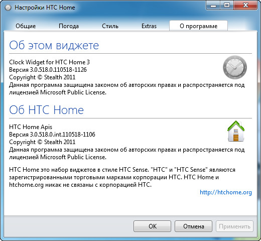 HTC Home Extras – это различные дополнения, которые расширяют функциональность виджетов. Это могут быть провайдеры погоды, ресурсы и т.д. Для установки дополнений, просто перетащите их на исполняемый файл любого виджета (Clock.exe, Weather.exe). Удалить их вы можете в настройках, на вкладке Extras.