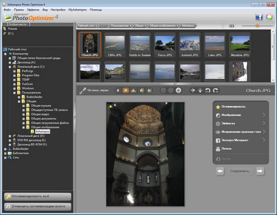 Ashampoo Photo Optimizer - простая в использовании программа для оптимизации и улучшения качества цифровых фотографий. Утилита позволяет корректировать контрастность, яркость и цветовой баланс. Все действия в программе производятся по нажатию необходимой кнопки на панели инструментов. Также, в данной программе предусмотрена пакетная обработка графических файлов. С помощью этой утилиты, снимки становятся ярче, светлее, приобретают четкость и контрастность. Если сравнивать показатели до и после преображения, заметно, насколько силен программный алгоритм оптимизации. Поработав однажды с этой программой, вы больше не захотите использовать любые другие, во многом – из-за экономии времени. Целые папки с изображениями автоматически просматриваются и преобразовываются. Исходные данные автоматически сохраняются в резервной папке и уничтожаются только когда пользователь полностью удовлетворен преображенными фотографиями. Программа обладает приятным пользовательским интерфейсом с многоязычной поддержкой, включая русский язык.