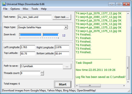 Universal Maps Downloader - это программа для загрузки частей спутниковых снимков-карт поверхности Земли c серверов Google, Yahoo или Microsoft для их дальнейшего просмотра встроенным обозревателем Maps Viewer и сборки в единое целое с помощью инструмента Maps Combiner. Для начала загрузки Вам необходимо указать папку для сохранения файлов, масштаб будущей карты, сервер, с которого будет произведена загрузка и географические координаты (широта, долгота) участка земной поверхности.