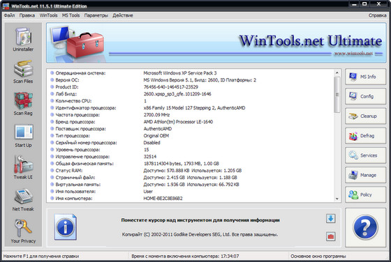 WinTools.net – набор инструментов для оптимизации операционной системы Windows. В состав программы входят компоненты для полного удаления нежелательных программ и «мертвых» ссылок реестра, а также для контроля процессов, настройки системы, интернет-соединений и интерфейса. Кроме того, имеются утилиты для надежного хранения конфиденциальной информации.