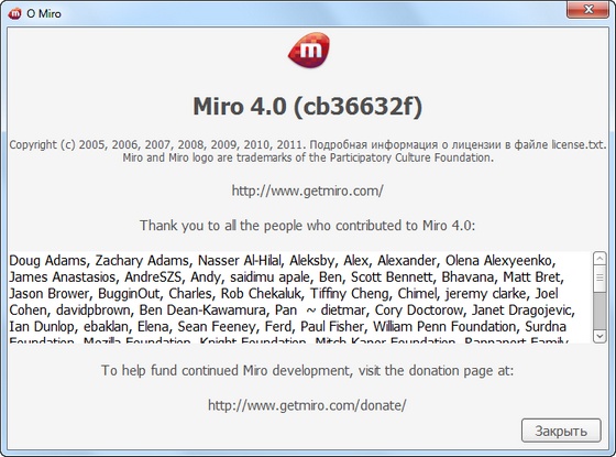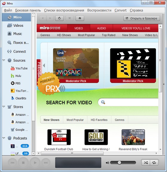 Miro - медиаплеер, основное предназначение которого - облегчение просмотра видео в Интернете. Плеер позволяет подключаться к видео-каналам, загружать видео-файлы на компьютер, просматривать ролики в полноэкранном режиме и т.д. Miro прост в работе и абсолютно бесплатен. Смотрите практически любое видео - Quicktime, WMV, MPEG, AVI, XVID и другие форматы. Просматривайте свою коллекцию, делайте плейлисты, сохраняйте порядок. Подписывайтесь на любые потоки RSS, содержащие видео, подкасты или видеоблоги. Исследуйте сотни свободных каналов при помощи встроенной программы передач.
