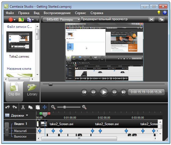 Camtasia Studio - мощная утилита для записи изображения с экрана в видеофайлы различных форматов, имеется возможность редактирования видео, есть встроенные Macromedia Flash (SWF) и видео проигрыватели. Camtasia захватывает действия и звуки в любой части Windows-систем и сохраняет в файл стандарта AVI.