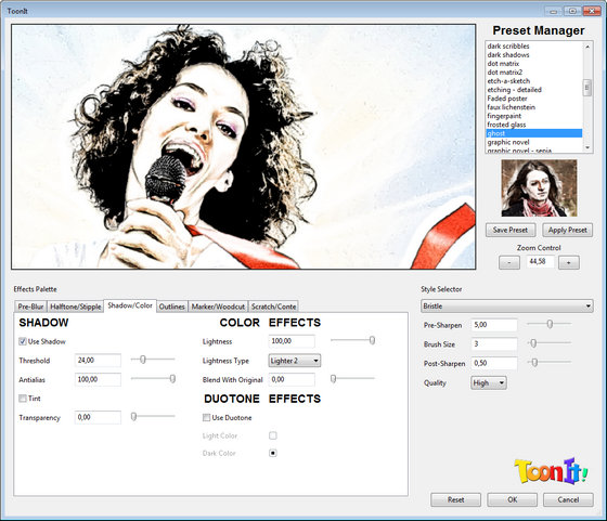 ToonIt! освободит Вас от трудоёмких методов подобных ротоскопингу и рисованию. Он позволяет создавать анимационные изображения из видео-кадров, фотографий и статичных изображений. ToonIt! анализирует изображение, затем уменьшает его цветную палитру и выявляет важные границы края. Края границ используются для формирования и управления областями цвета. В состав ToonIt! входят четыре основных фильтра такие как: Flat Cartoon, Graphic Novel, Line Art и Pen & Ink.