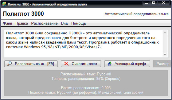 Полиглот 3000 (или сокращённо П3000) – это автоматический определитель языка, который предназначен для быстрого и корректного определения того на каком языке написан введённый Вами текст. Программа работает в операционных системах Windows 95/98/NT/ME/2000/XP/Vista/7.