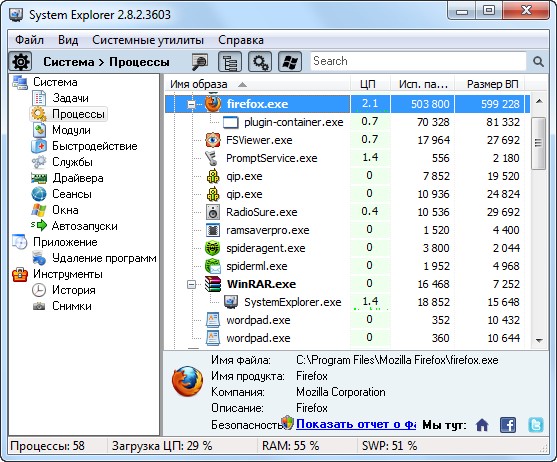 Не пропустит System Explorer и процессы, использующие сеть. Из раздела "система" можно деинсталлировать переставшую быть нужной программу, изменить параметры автозапуска ОС, просмотреть драйвера устройств. В общем, если вас не устраивает стандартный диспетчер задач, попробуйте System Explorer.