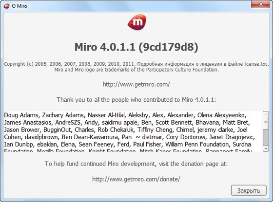 Miro - медиаплеер, основное предназначение которого - облегчение просмотра видео в Интернете. Плеер позволяет подключаться к видео-каналам, загружать видео-файлы на компьютер, просматривать ролики в полноэкранном режиме и т.д. Miro прост в работе и абсолютно бесплатен. Смотрите практически любое видео - Quicktime, WMV, MPEG, AVI, XVID и другие форматы. Просматривайте свою коллекцию, делайте плейлисты, сохраняйте порядок. Подписывайтесь на любые потоки RSS, содержащие видео, подкасты или видеоблоги. Исследуйте сотни свободных каналов при помощи встроенной программы передач.