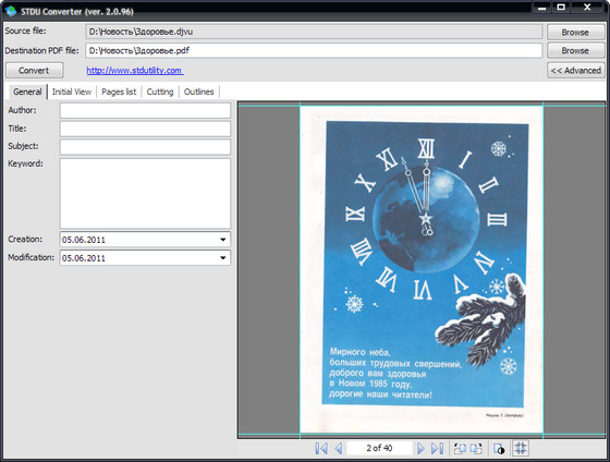 STDU Converter - конвертор DjVu в PDF всего в два клика. Вы можете конвертировать только часть книги или ее целиком, а так же выстроить свое дерево документа на выходе. Пользоваться чрезвычайно просто, - находите документ в DjVu или TIFF формате и нажимаете кнопку "Старт", и Все! Не забудьте только, указать папку куда вы будите складывать готовые PDF файлы.