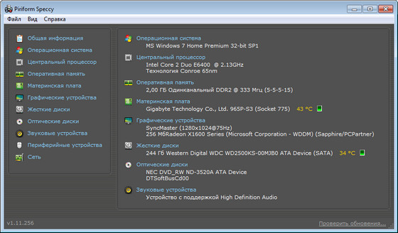 Speccy - это небольшая утилита от разработчиков популярнейшего приложения для очистки компьютера от системного мусора CCleaner. При запуске Speccy мониторит аппаратную часть компьютера, и отображает информацию об операционной системе и характеристики установленного железа. С помощью программы пользователь сможет узнать версию операционной системы, подробную информацию о процессоре, операционной памяти, винчестере, материнской плате, видео карте и др. Кроме того, отображаются температурные показатели процессора и видеокарты, а также рабочая частота RAM и скорость шины процессора.