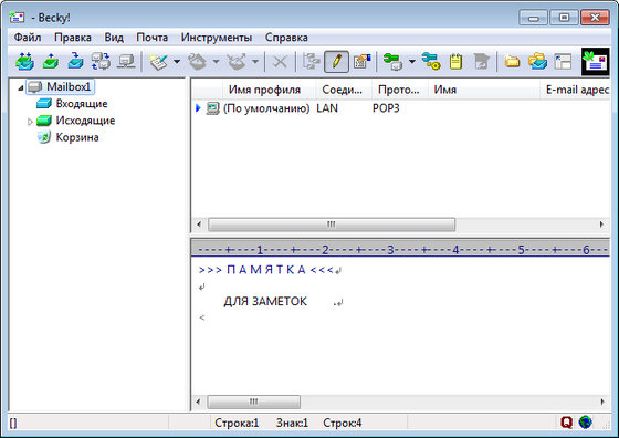 Becky! Internet Mail - это почтовая программа с умением создавать HTML-письма, с возможностью приема почты по POP3 и IMAP4 протоколам, с шаблонами и макросами для автоматизации работы с почтой, с возможностью создания нескольких профилей для одного почтового ящика, со способностью напоминать о событиях и автоматически отправлять в назначенный срок поздравления юбилярам, включает встроенное PGP-шифрование, создание аудиописем, менеджер листов подписок и мощные возможности по сортировке писем.