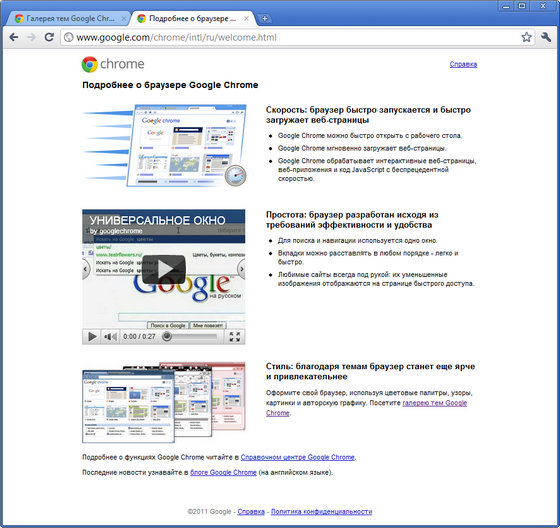 Google Chrome - веб-браузер производства Google с открытым исходным кодом, сочетающий поддержку веб-приложения и удобный поиск с высокой скоростью и стабильностью. В Chrome использованы наработки Apple WebKit и Mozilla Firefox. Из особенностей Chrome разработчики особо выделяют изолированные вкладки, предотвращающие сбой работы программы и обеспечивающие более надёжную защиту от опасных сайтов. Кроме этого, в Chrome реализован новый движок JavaScript V8, который позволит браузеру работать с веб-приложениями нового поколения.