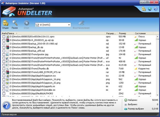 Если вы случайно удалили важный документ или любимую песню с компьютера, это не проблема. Просто используйте эффективные функции поиска Ashampoo Undeleter и программа найдет и покажет вам список всех удаленных файлов. В этом списке вы сможете увидеть состояние каждого файла - какие файлы могут быть восстановлены полностью или частично. Функции восстановления Ashampoo Undeleter обширны и не ограничиваются только жесткими дисками вашего компьютера. Удаленные файлы также могут быть обнаружены и восстановлены на внешних дисках USB, USB флэш-дисках и других носителях.