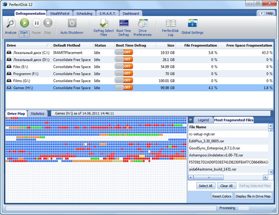 Данные в этой таблице отображаются в виде разноцветных квадратиков, расшифровку цвета которых можно посмотреть в главном окне PerfectDisk. Стоит отметить довольно быструю работу утилиты. Это связано с тем, что используется однопроходный метод дефрагментации с учётом S.M.A.R.T. данных винчестера. Может дефрагментировать не только локальные диски, но и с сетевые, причем в этом случае для облегчения настройки заданий используются профили сетевого планирования дефрагментации и полностью настраиваемое протоколирование работы. Поддерживаются работа с RAID-томами.